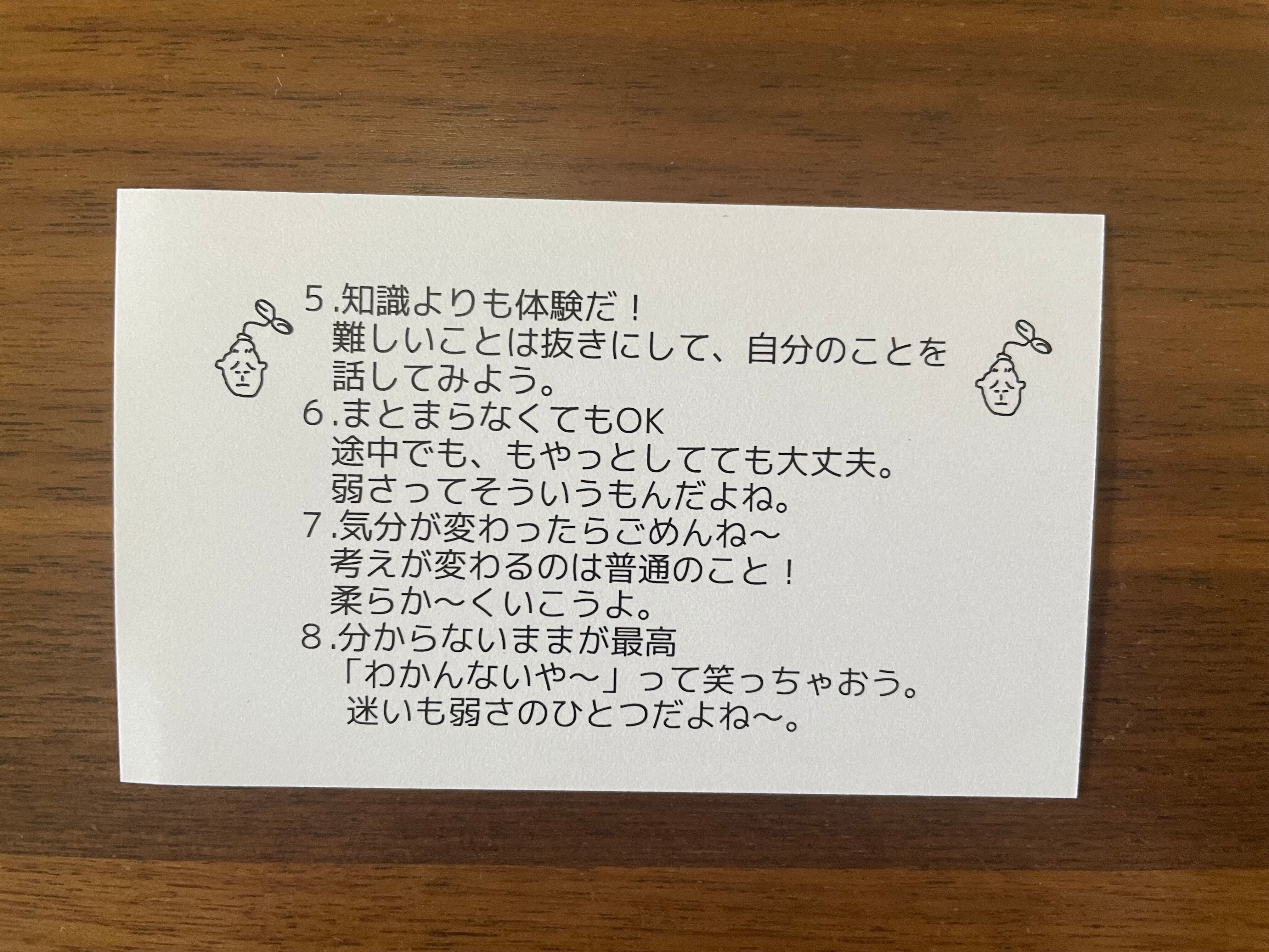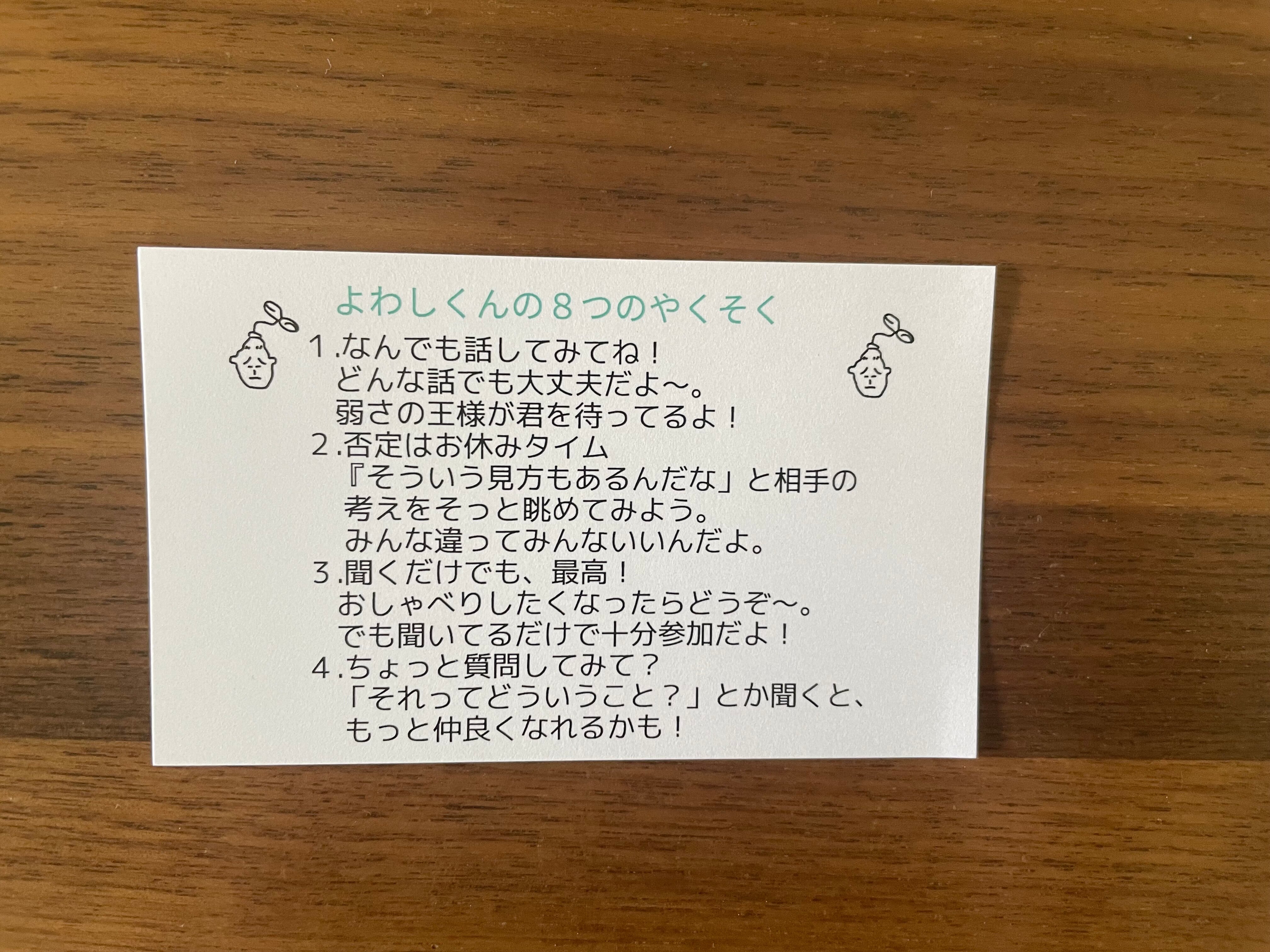 ・このカードゲームは、自分の弱さを他者に伝える「自己開示」をします。人とのつながりを深め、自分を無理なく受け入れる助けとなることを目指します。