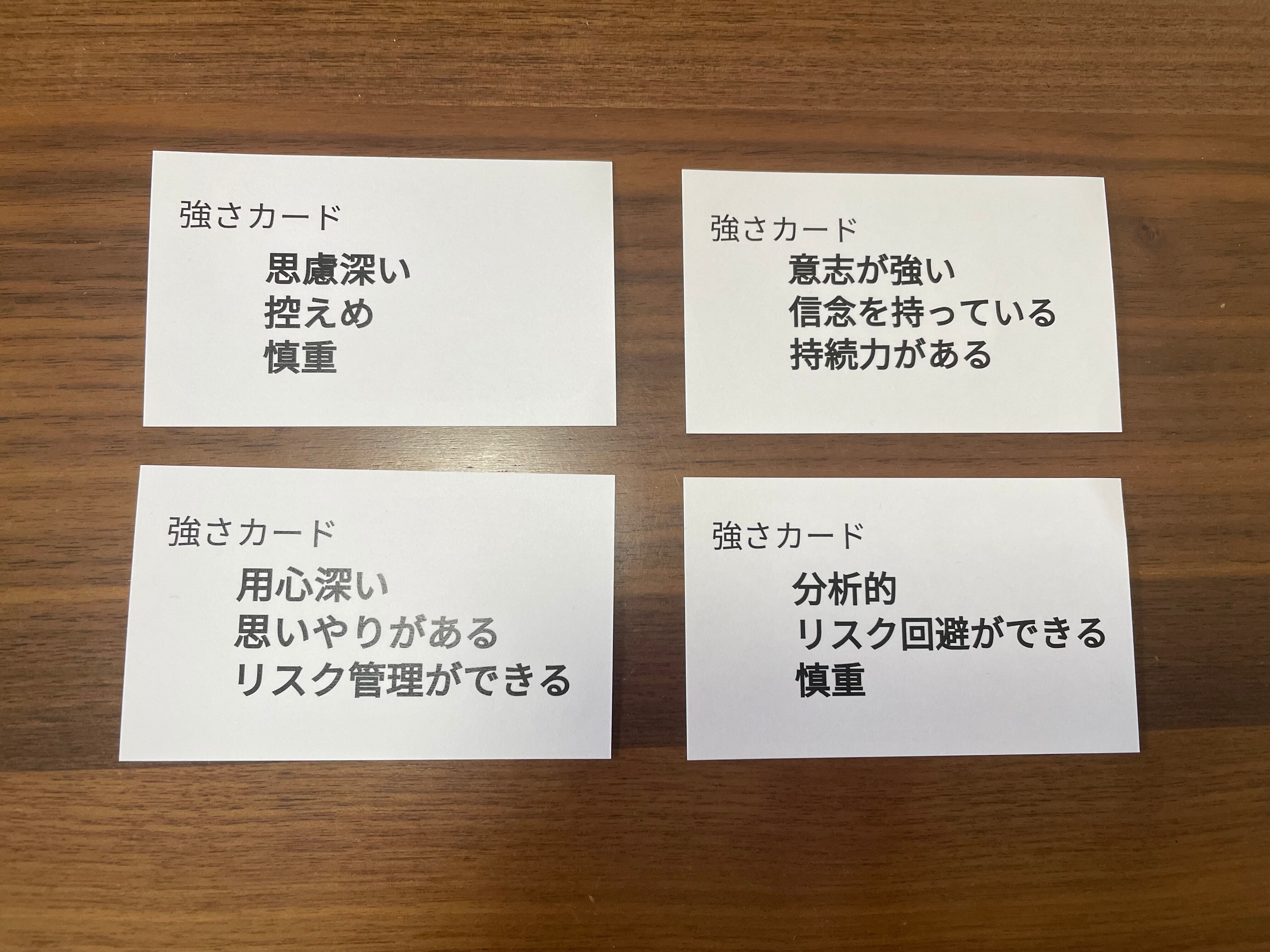 次に、その「弱さ」を「強さ」に言い換えるとしたらどうなるかを他のプレイヤーが一人ずつ考えます。例えば、「優柔不断」なら「慎重に物事を考えられる強さがあるのでは?」という具合に発表します。思いつかない場合はパスも可能です。困ったときは、以下の例を参考にしてみてください: